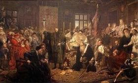 | 波蘭自14世紀建立統一國家和擊敗條頓騎士團後,逐漸成為東北歐的重要國家。1386年立陶宛大公約蓋拉Iogaila兼任波蘭國王(稱弗拉迪斯拉夫二世Wladislaw II),開創波蘭歷史上的「雅蓋羅Jagiello王朝」,使兩國開始走向聯合。從1434年起兩國形成較為穩定的「君合」關係。1561年立陶宛取得立窩尼亞Livonia北部地區,次年成立征服者政權-立窩尼亞親王國,自此波蘭國王又以立陶宛大公的身份兼任立窩尼亞親王。1569年7月1日兩國貴族在盧布林Lublin議會上訂立《盧布林聯合令》,宣佈兩國組成「政合國」-波蘭-立陶宛Poland-Lithuania王國(又稱波蘭-立陶宛聯合體Polish-Lithuanian Commonwealth),成立共同議會。自此波蘭遂控制立陶宛及其屬地立窩尼亞、烏克蘭Ukraine和白俄羅斯Belarus,成為東歐強國。17-18世紀波蘭-立陶宛走向衰落,在18世紀末曾先後三次為俄羅斯、奧地利和普魯士瓜分,至1795年1月7日波蘭-立陶宛(連同其屬地)被瓜分殆盡,最終滅亡。 |