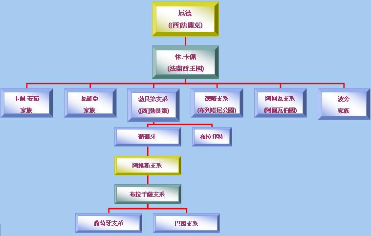 3. 勃艮第支系源自法蘭西國王亨利一世Henri I。1015年當時尚未繼承法蘭西王位的亨利一世被封為[西]勃艮第公爵(稱亨利二世Henri II)(註1),形成勃艮第支系。此後該支系在西歐若干個國家擴充勢力。1095年該支系成員亨利Henri被封為葡萄牙伯爵,是為葡萄牙立國之始。1405年布拉邦特攝政安東尼.布爾哥尼Antoine de Bourgogne繼任公爵,從而在布拉邦特建立勃艮第支系的統治。14世紀起,勃艮第支系的勢力逐漸衰落,該支系在[西]勃艮第和布拉邦特的統治先後為瓦羅亞家族取代。而葡萄牙的勃艮第王朝亦於1385年為該家族的一個支系阿維斯Aviz家族推翻。