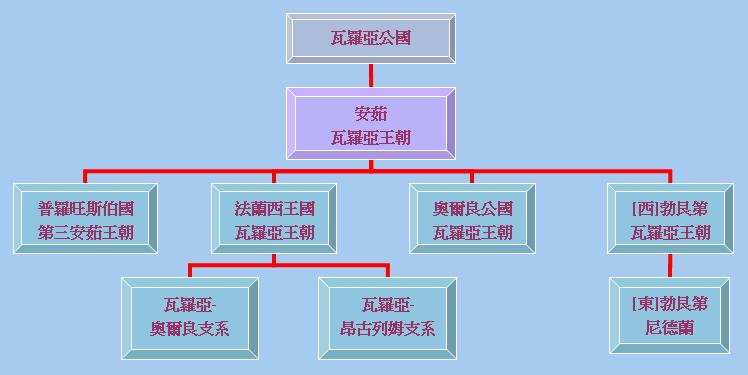 瓦羅亞家族原為法蘭西卡佩家族的一個支系,最初為瓦羅亞公國的統治家族。1290年瓦羅亞公爵查理三世Charles III繼為安茹伯爵,建立第三個統治安茹的王朝,故該家族又稱「第三安茹Third Anjou家族」。1328年安茹伯爵腓力Philippe繼任法蘭西國王(稱腓力六世Philippe VI),開創法蘭西歷史上的瓦羅亞王朝。此後瓦羅亞家族及其支系(包括瓦羅亞-奧爾良Valois-Orleans支系和瓦羅亞-昂古列姆Valois-Angouleme支系)統治法蘭西二百多年(註1),其間法蘭西曾經歷百年戰爭和宗教戰爭。1589年法蘭西王位轉歸波旁家族,此後法蘭西進入強盛時期。