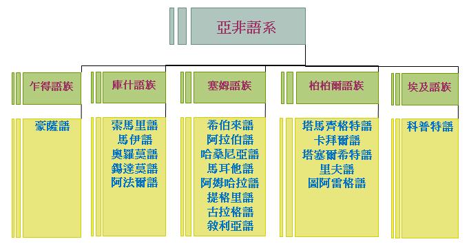 「亞非語系」(亦稱「塞姆-哈姆(Semito-Hamitic)語系」)主要分佈於西南亞和北非,分為「塞姆(Semitic)語族」、「埃及(Egyptian)語族」、「柏柏爾(Berber)語族」、「庫什(Cushitic)語族」、「奧莫特(Omotic)語族」和「乍得(Chadic)語族」,此外還有一些未歸類語言。這個語系包含上述地區多個國家主體民族和少數民族的語言,其中希伯來語(Hebrew)和阿拉伯語(Arabic)分別是世界上兩個重要宗教-猶太教(Judaism)和伊斯蘭教(Islam)的語言。此外,由於歷史上阿拉伯人的擴張和伊斯蘭教的傳播,阿拉伯語是現今多個國家的官方語言,也曾對世界上其他語言發揮重大影響。以下是「亞非語系」主要語言的譜系圖(註1): | |