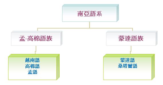 「南亞語系」主要分佈於印度支那半島和南亞半島東北部,分為「孟-高棉(Mon-Khmer)語族」和「蒙達(Munda)語族」。這個語系包含印度支那半島上兩個國家(即越南(Vietnam)和柬埔寨(Cambodia)主體民族的語言和印度東部一些少數民族的語言,這些民族在歷史上曾受漢藏語系諸民族和台-卡岱語系諸民族擠壓,因此其分佈範圍被分割成互不相連的地域。以下是「南亞語系」主要語言的譜系圖: |