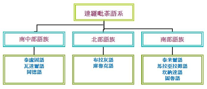 「達羅毗荼語系」主要分佈於南亞半島,分為「北部(Northern)語族」、「中部(Central)語族」、「南中部(South-Central)語族」和「南部(Southern)語族」,此外還有一些未歸類語言。這個語系包含南亞半島多個民族的語言,一般認為這些民族的祖先是上古印度河(Indus)文化的創建者。印度河文化衰落和雅利安人(Aryan)入侵印度後,大部分達羅毗荼人被迫向南遷徙,形成今天「達羅毗荼語系」大部分語言分佈於南亞半島南部,小部分分佈於南亞半島北部的局面。以下是「達羅毗荼語系」主要語言的譜系圖(註1): | |