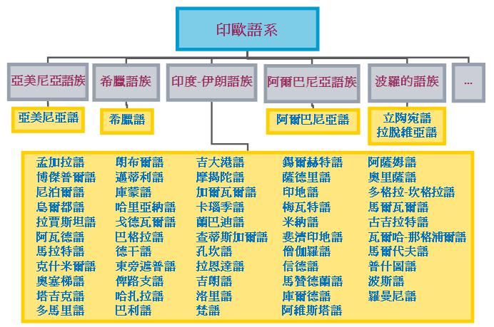 「印歐語系」廣泛分佈於南亞、伊朗(Iran)、歐洲、美洲和大洋洲西南部,分為「印度-伊朗(Indo-Iranian)語族」、「亞美尼亞(Armenian)語族」、「斯拉夫(Slavic)語族」、「波羅的(Baltic)語族」、「阿爾巴尼亞(Albanian)語族」、「希臘(Greek)語族」、「日耳曼(Germanic)語族」、「意大利(Italic)語族」和「凱爾特(Celtic)語族」。這個語系包含上述地區多個國家主體民族和少數民族的語言。由於歐洲多個國家曾進行殖民擴張,把他們的語言帶到世界各地的殖民地,成為某些「移民國家」(如加拿大(Canada)、美國(USA)、澳大利亞(Australia)、新西蘭(New Zealand))以及眾多前殖民地國家的官方語言,因此這個語系是包含最多國家官方語言的語系。此外,由於歐美各國由近代起成為世界強國,他們的語言曾對世界上其他語言發揮重大影響。以下是「印歐語系」主要語言的譜系圖: |