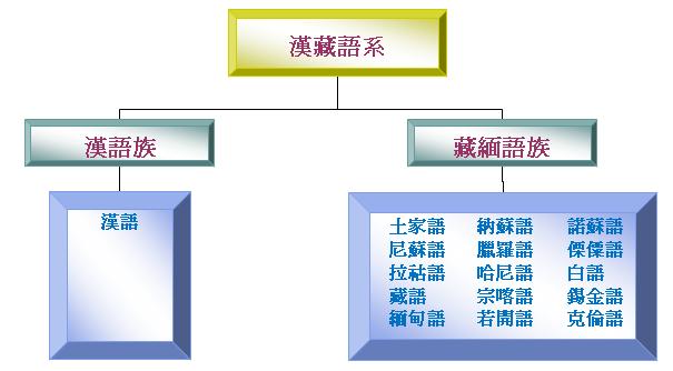 「漢藏語系」主要分佈於中國(China)、印度支那半島(Indochina Peninsula)和南亞半島(South Asian Peninsula)北部,分為「漢(Chinese)語族」和「藏緬(Tibeto-Burman)語族」。這個語系是現今世界上母語人數最多的語系,包含著世界上人口最多國家(即中國)主體民族-漢族的語言。由於中國是東亞歷史上的大國,其語言對周邊地區的其他語言曾有重大影響。以下是「漢藏語系」主要語言的譜系圖: |