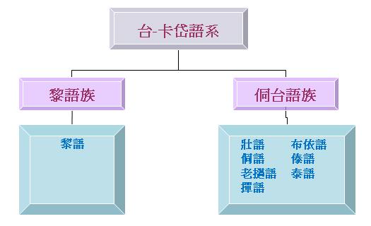 「台-卡岱語系」(在中國又稱「壯侗(Zhuang-Dong)語系」),主要分佈於中國南部和印度支那半島,分為「侗台(Kam-Tai)語族」、「黎(Hlai)語族」和「仡央(Kra)語族」,此外還有一些獨立語言。這個語系包含中國南部某些少數民族的語言和印度支那半島上兩個國家(即老撾(Laos)和泰國(Thailand))主體民族的語言。由於這些民族與中國有歷史淵源,有一些學者把這個語系視為「漢藏語系」下的一個語族。以下是「台-卡岱語系」主要語言的譜系圖(註1): | |