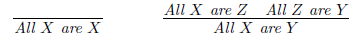 上圖中的X、Y和Z代表任意謂詞。此外,上圖中的兩條推理規則都包含一條橫線,這條橫線可以粗略地看成代表「推導」,即可以從橫線上的(零個或兩個)語句推導出橫線下的語句。第一條規則代表我們可以「無中生有」地推導出任何形如All X are X的語句,例如All A are A等(註2)。第二條規則則代表,我們可以從語句All X are Z和All Z are Y推導出All X are Y。