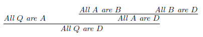 代表可通過運用L(all)中的推理規則,從前提集合Σ推導出結論p。在上式中,我們也說p是Σ的「語形後承」(syntactic consequence),或者說從Σ到p的推論是「可證明」(provable)的。舉例說,下圖展示在L(all)下從前提集合{All Q are A, All A are B, All B are D}推導出結論All Q are D的「證明樹」(proof tree):