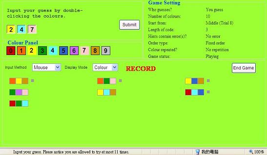 In the former case, an Error button will appear after the first guess has been made. If you detect that the hints provided are inconsistent, you can press the Error button. The computer will then determine whether the hints given have really led to inconsistencies. If so, all the errors will be corrected and you can then continue guessing until you break the code. If the hints do not lead to inconsistencies or if you detect the inconsistencies too late, you will lose the game. Please notice this game setting is quite demanding of the player: not only do you need to detect the inconsistencies (if any), but you have to detect them "at the right time".
