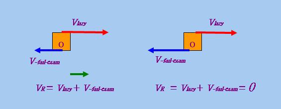 在上述兩句中,(6)表達「原因」,(7)表達「讓步」。現在讓我們把以上兩句的「主體」"John failed the exam"看成靜止物體O可能移動的方向,不妨把這個方向定為水平向右的方向,那麼以上兩句的「因素」"he was lazy"便可以表達為向右的向量vlazy,這個向量代表「推動力」,它試圖令O移動,即導致John在考試中不及格。此外,我們還有一個向左的向量,這個向量代表「靜摩擦力」,它阻止「John不及格」成為事實。請注意以上兩句並沒有說明是哪些因素阻止「John不及格」成為事實,但我們可以憑常理推斷大概存在哪些因素(例如「John運氣好」、「試題太淺易」等),因此我們把這些因素的合力表達為一個向左的向量v~fail-exam。把上述兩個向量相加後所得「合向量」vR的方向反映了兩個力量角力的結果。下圖顯示角力的兩種可能結果: