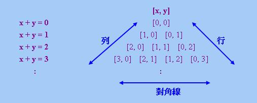對於「有限論域邏輯限定詞」而言,我們還可以把它們表現為「數字三角形」的形式,即由「+」號和「−」號組成的三角形,三角形上的位置對應著下圖中的有序對: