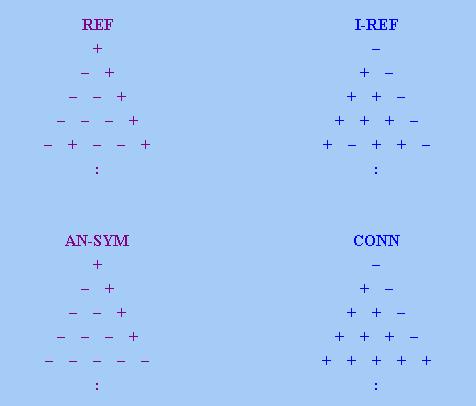 從「數字三角形」的角度看,根據(iv),「傳遞限定詞」的「數字三角形」分為上下兩部分,上半部的每條「對角線」要麼全是「+」號,要麼全是「−」號;而下半部的每條「對角線」要麼全是「−」號,要麼只有最右的位置取「+」號。類似地,「近連通限定詞」的「數字三角形」也分為上下兩部分,上半部的每條「對角線」要麼全是「+」號,要麼全是「−」號;而下半部的每條「對角線」要麼全是「+」號,要麼只有最右的位置取「−」號。下圖顯示「傳遞限定詞」和「近連通限定詞」的「數字三角形」特徵: