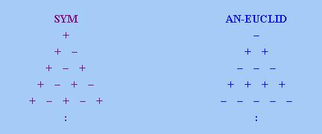 至於其餘兩點,(v)是說,「對稱限定詞」的「數字三角形」上每「列」要麼全為「+」號,要麼全為「−」號。(vi)是說,「反歐幾里德限定詞」的「數字三角形」上每條「對角線」要麼全為「+」號,要麼全為「−」號。請注意此一結果跟《廣義量詞系列:單調性的進階研究》5.3小節中的圖完全吻合(請記著在本文中,SYM等價於INT)。由此也證明了,本文對「反歐幾里德性」的定義跟上述網頁的定義等價。下圖顯示上述兩種性質的「數字三角形」特徵: