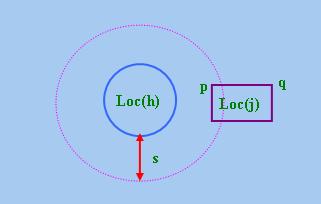 上圖中的虛線圓形代表NEAR(Loc(h))的範圍,其中s代表某長度標準。從上圖可以看到,要令上句真,只需Loc(j)的部分點(即離Loc(h)最近的那些點,例如p)在NEAR(Loc(h))的範圍內便可以。事實上,即使Loc(j)上的點q離Loc(h)較遠,也無損於上句的真實性。因此,對於表達距離的語句而言,不適宜像上面(2)那樣表達為Loc(j) ⊆ {...}的形式,因為這裡無需要求整個Loc(j)被包含在集合{...}內。為正確表達上句的語義,我們需要把Loc(j)換成另一個點集合,即Loc(j)中離Loc(h)最近的那些點組成的集合,這個集合就是{p ∈ Loc(j): Dist({p}, Loc(h)) = Dist(Loc(j), Loc(h))}。利用這個集合,我們可以把上句表達為