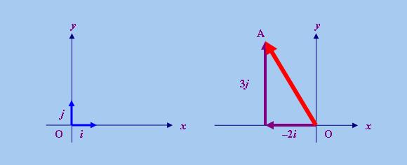 舉例說,在上面左圖中,我們選定了「原點」O、「坐標軸」x和y以及單位長度,這樣我們便有兩個「單位向量」,分別為與x軸平行的i和與y軸平行的j (註2)。在上面右圖我們有一個「向量」OA (這種寫法表示該「向量」是以點O為「起點」Start-Point,並以點A為「終點」End-Point)。利用上述「單位向量」,我們便可以把OA分解為兩個互相垂直的「分量」:−2i和3j,並且根據「向量」的加法有: