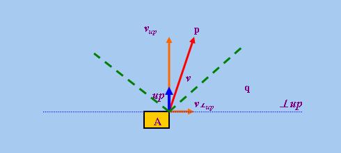 在上圖中,p和q是A以外的點,v是以p為「終點」的「向量」。該「向量」被分解為vup + v⊥up,其中vup與up平行,v⊥up則在直線⊥up上。由於v • up > 0,這說明v在垂直方向上的「分量」(即vup)與up同向,即v大致上是向上指的。此外,由於|vup| > |v⊥up|,「向量」v符合上述ABOVE(A)的另一條件,所以我們可以說點p位於A的上方。