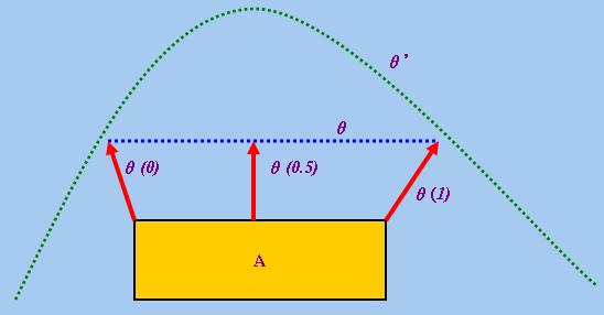 上圖刻劃"over A"的語義,θ (即藍色虛線)代表符合"over A"語義的其中一條「路徑」。θ的輸出值都是A的「最近向量」,其中θ(0)、θ(0.5)和θ(1)分別為該「路徑」的源點向量、中間點向量和終點向量。請注意"over A"的語義並不要求整條「路徑」都必須在A的上方,例如在上圖中θ' (即綠色虛線)便是另一條符合"over A"語義的「