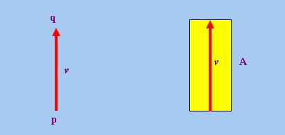上面左圖顯示一個從點p指向點q的「位置向量」v,右圖的A則是一個長方形物體(亦可看成圓柱體的某個切面),圖中的v就是該物體的「軸心向量」。我們可以仿照Zwarts,使用Axis(A, v)的形式表示向量v是物件A的「軸心向量」。