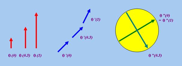 上句可以用John的「軸心路徑」θ來表達(見上面左圖),在θ上的所有「向量」都是垂直向上的,並且這些「向量」的長度在不斷遞增。根據以上分析,我們可以把上句表達為: