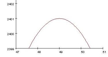,即隨著n的值改變,f(n)的值也作相應變化。由於f(n)是一個二次多項式函數,而且其二次項系數取負值,所以其圖象是一條開口向下的拋物線。這條拋物線存在一個最高點,這個最高點的y坐標和x坐標就是我們所求的最大值和相應的n的值。接著下來我們可以繪出f(n)的圖象並求這個最大值。以下筆者使用一個數學運算軟件繪出f(n)的圖象,並對近最大值處作局部放大: