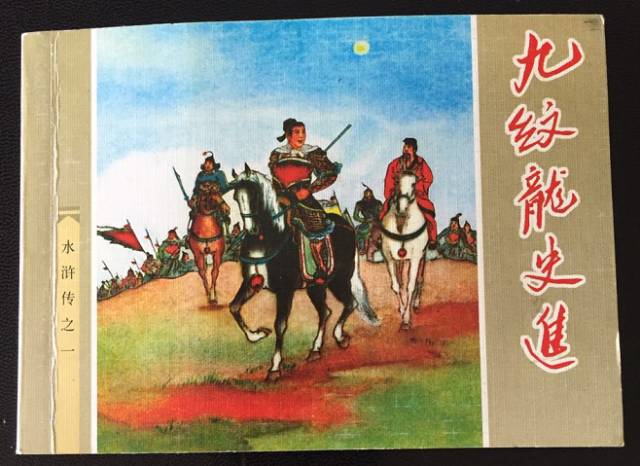 20世紀也出現了新的繪畫形式-連環畫,因而也出現以《水滸傳》作為題材的「水滸連環畫」。民初時期的「水滸連環畫」主要是作為一種商品存在,在1949年以後,由於大陸官方把《水滸傳》定性為「農民起義教科書」,而連環畫又有簡單易明的優點,可以用作一種政治宣傳工具,因此「水滸連環畫」在這一時期有很大發展,出現了大批作品,其中人民美術出版社《水滸傳》(共26冊)堪稱這些作品中的經典,下圖展示這套連環畫第一冊《九紋龍史進》的封面: