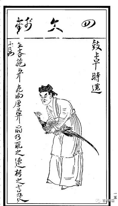 另一種畫作則是水滸人物畫,這些畫作可以是獨立存在的人物畫,例如杜堇《水滸人物全圖》;也可出現於某些用品中,例如陳洪綬《水滸葉子》。「葉子」是明清時代一種用於行酒令或博奕的紙牌,「水滸葉子」就是指繪有《水滸傳》人物的葉子。陳洪綬的「水滸葉子」廣受歡迎,後來更被用作《水滸傳》小說開首的人物畫,稱為「繡像」。下圖展示繪有「時遷」的葉子(下圖中的公雞顯然就是時遷在祝家店所偷的雞):