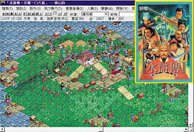 日本也是電子遊戲大國,很早便出現與《水滸傳》有關的電子遊戲(比前文介紹的電子遊戲更早),例如屬於格鬥類的《水滸演武》、屬於戰略類的《水滸傳天導108星》、屬於角色扮演類的《幻想水滸傳》等,其中《水滸傳天導108星》特地請了前述的正子公也繪製梁山一百零八人的造型,《幻想水滸傳》則更衍生出上文提過的《幻想水滸傳III》漫畫。下圖展示《水滸傳天導108星》(漢化版)的包裝封面和遊戲畫面: