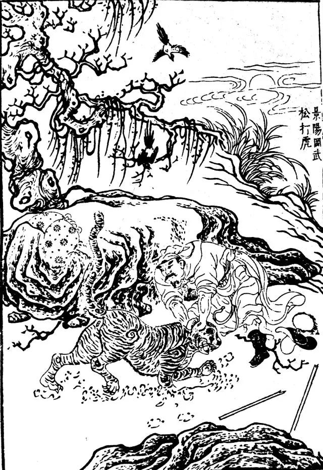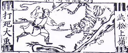 而下圖則展示「容與堂百回本水滸傳」(「繁本水滸」的一種)中「景陽岡武松打虎」的插圖: