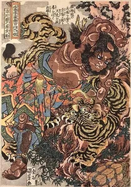 《水滸傳》作為世界級名著,對其他國家也有影響,日本是受影響最深的國家,因而也出現了大批與《水滸傳》有關的藝術作品/商業產品。在畫作方面,跟前述我國的情況相似,日本人創作的與《水滸傳》有關的畫作也分為若干種類型:人物畫像、小說插圖和漫畫。江戶時代便曾出現歌川國芳《水滸傳豪傑百八人》,下圖展示歌川國芳筆下的武松: