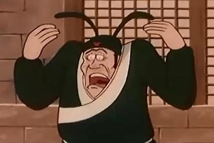 接著討論「水滸動畫」,這類動畫是晚近才出現的事物,直至1960年代才在臺灣地區出現首部「水滸動畫」-《武松打虎》(1960年),而且片長只有20分鐘。第一部較有規模的「水滸動畫」則是香港地區的《水虎傳》(1982年),這是截取前述《水虎傳》漫畫中老夫子回到宋代遇見武松的故事而成的動畫(沒有原著中老夫子遇見林沖、楊志、宋江等的故事),下圖展示上述動畫中西門慶變成「縮頭龜」的一幕: