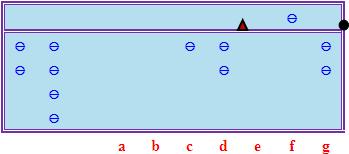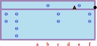 接下來進行「減積」,其方法跟「歸除法」下的「減積」過程非常相似。首先計算5 × 2,得10,把這個積從c、d檔減去;然後計算5 × 4,得20,把這個積從d、e檔減去,其結果如下圖所示(請注意以上運算實質上是從被除數減去500 × 24 = 12000):