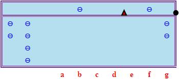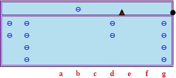 如果繼續這個過程,嘗試從g、h檔減去3 × 7 = 21,我們勢必會得到負數,這顯示商數3過大。這時我們可以把商數從3調低為2,但把商數調低後,我們必須把剛才從被除數的餘下部分多減了的683400補回去,即在d檔加6、e檔加8、f檔加3、g檔加4,其結果如下(比照「中途退商法」中的口訣,我們不妨把上述操作概括為口訣「無除起一隔還六八三四」,這種口訣或可稱為「中途隔位退商法」口訣)(註3):