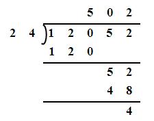 上圖顯示12052 / 24 = 502..4,與前述直式除法的結果一致。