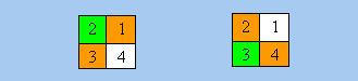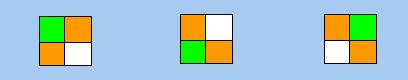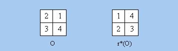 以上兩式分別代表上圖左、右兩個「著色」方案,o、g和w分別代表橙色、綠色和白色。接著我們考慮D4對F的「作用」。請注意我們不能把表1所列的「一行式」直接應用於F的元素,這是因為表1的「一行式」是就D4「作用」於O而言的。現在D4的「作用」對象是F而非O,因此以下用g**來表示D4的元素g對F的「作用」,而g*則表示g對O的「作用」,並希望求得g**與g*的關係。為此,我們首先集中研究D4的元素r對F的「作用」。上面右圖正是r「作用」於左圖的結果,因此我們應有
