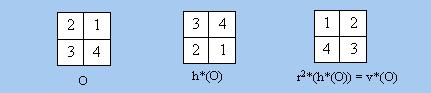 根據以上定義,上述的各種「標準運動」便是集合G的元素。在「抽象代數學」中,這個「標準運動群」有一個專有名稱:「4階二面體群」(Dihedral Group of Degree 4),一般記作D4。D4所包含的「標準運動」包括:繞圖中心按逆時針方向旋轉0度(以e表示)、旋轉90度(以r表示)、旋轉180度(以r2表示)、旋轉270度(以r3表示)(註3)、以中垂線為對稱軸作反射運動(以v表示)、以穿過圖中心的水面線為對稱軸作反射運動(以h表示)、以圖形的「主對角線」(即從左上角到右下角的對角線)為對稱軸作反射運動(以m表示),以及以圖形的「副對角線」(即另一條對角線)為對稱軸作反射運動(以n表示)。上述運動的「複合」(Composition)構成D4上的「運算」「•」。舉例說,如果我們對上面最左面圖形進行h運動,便可得到上面中間的圖形,接著如果再對該圖形作r2運動,便可得到上面最右面的圖形。可是這個圖形正好是對最左面圖進行v運動後所得的結果。以上結果可以表達為以下算式: