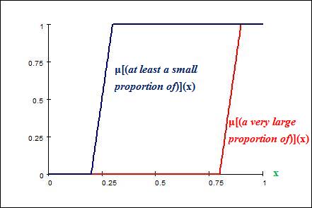 現在就讓我們來證明(2)的有效性。為方便討論,以下提供「模糊量詞」"(a very large proportion of)"和"(at least a small proportion of)"的「隸屬度函數」的圖象: