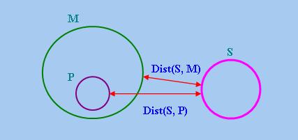 但上式過於繁複,不方便進行推理,所以以下改用文字與符號夾雜的方法。為簡化討論,以下只考慮一個特殊情況,就是假設S、P和M僅包含平面上的一個點。為易於理解,讀者可參考下圖: