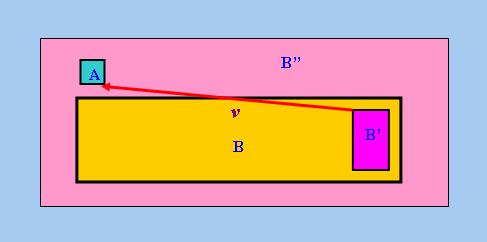 容易看到,大多數表達空間位置的詞項都具有ABOVE那樣的「向量單調性」(註9),不過也有少數例外。INSIDE便是一個顯著的例子,儘管這個詞項是「左向量遞減」的,但卻不是「左向量遞增」的,這是因為把點集合A的某一個「內部最近向量」延長後,所得結果不一定仍是A的「內部最近向量」(該向量的「終點」可能不再在A內)。至於「右向量單調性」,以下兩圖顯示,儘管v'是B的「邊界向量」,但卻不一定是B的「內部最近向量」: