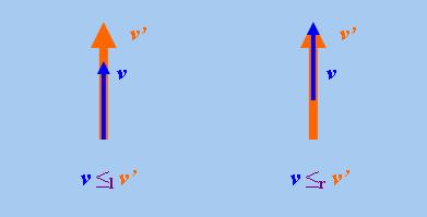 我們可以把上述結果應用於某些日常推理中。舉例說,從上面最左圖,我們可以得到以下「左向量單調性推理」(以下把A理解為某幢房子的屋頂,並把v和v'分別理解為某架飛機和某隻鳥兒在某一時刻相對於屋頂的位置向量):