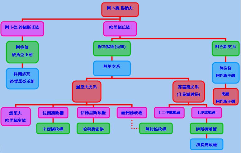 2b. 謝里夫支系是阿里的兒子(即穆罕默德的外孫)哈桑Hasan的後裔。656年起阿里父子先後出任阿拉伯教主,但在661年哈桑被倭馬亞氏族擊敗,被迫退位。自此伊斯蘭教分裂為遜尼派和什葉Shiah派,哈桑成為什葉派的教長(Imam)(但從669年起什葉派教長之位轉歸哈桑之弟侯賽因Husain及其後裔)。此後謝里夫支系在各地繁衍,在阿拉伯半島、也門和摩洛哥先後建立多個政權,包括謝里夫哈希姆Sharifian Hashim家族在阿拉伯半島、伊拉克、敘利亞建立的多個政權(詳見下節)、也門的拉西德Rassid政權及其後裔建立的卡西姆Qasim政權、摩洛哥的伊德里斯Idris政權及其後裔哈穆德Hammud家族在西班牙建立的多個政權(詳見「歷代跨國王朝簡介(西歐)」有關「哈穆德家族」的介紹),以及摩洛哥的薩阿德Sad政