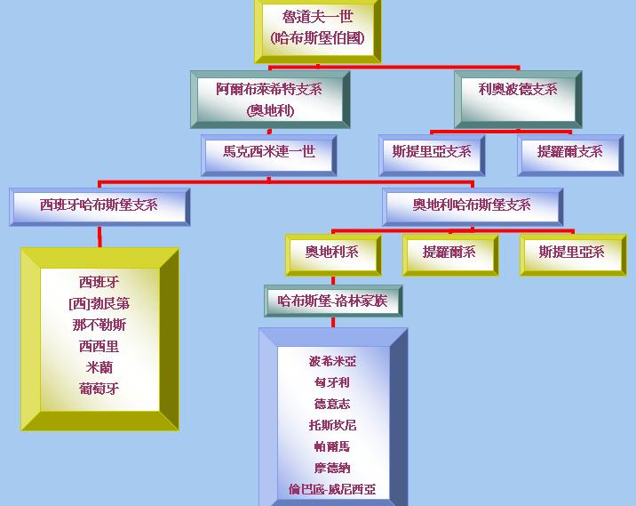 2. 奧地利哈布斯堡支系起初僅統治奧地利,其後又取得波希米亞和匈牙利,並繼承德意志國王和神聖羅馬皇帝尊號。1564年腓迪南一世死後,三子分立,該支系遂又分裂為奧地利系、提羅爾系和斯提里亞系。但至1665年該支系重歸統一。17世紀末奧地利擊敗奧斯曼,奪取匈牙利全部後,奧地利自此成為中歐強國。1736年[上]洛林[Upper] Lorraine公爵弗朗索瓦三世Francois III與奧地利公主馬利亞.特里薩Maria Theresa(1740年繼為奧地利大公)結婚,自此形成哈布斯堡-洛林Habsburg-Lorraine家族(在北意大利此家族又稱洛林-哈布斯堡Lorraine-Habsburg家族)。1737年弗朗索瓦三世改任托斯坎尼Tuscany大公(稱弗朗切斯科二世Francesco II),從此開始洛林-哈布斯堡家族在北意大利的統治。1780年馬利亞.特里薩死後,奧地利君位轉歸哈布斯堡-洛林家族。其後此家族在北意大利又取得帕爾馬Parma、摩德納Modena和倫巴底-威尼西亞Lombardy-Venetia(註2)的統治權,使奧地利的勢力伸展至北意大利。1864年哈布斯堡-洛林家族的成員馬克西米連Maximilian參與干涉墨西哥的戰爭,被法蘭西立為墨西哥皇帝(稱馬克西米利亞諾Maximiliano,該政權俗稱為「馬克西米利亞諾Maximiliano帝國」),但該政權在1867年便被墨西哥共和政府推翻。與此同時,奧地利亦為撒丁和普魯士擊敗,喪失在北意大利和德意志的霸權,但哈布斯堡-洛林家族仍然保持在中、東歐的大幅領地,世稱為「奧地利-匈牙利Austria-Hungary帝國」。但在第一次世界大戰後,奧地利戰敗,帝國各地爆發革命和民族獨立運動,哈布斯堡-洛林家族的統治最終結束。