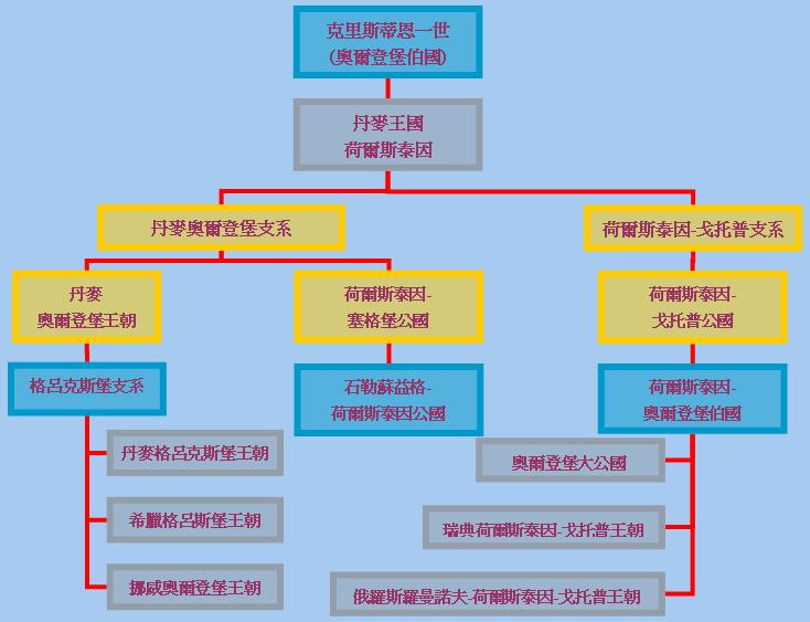 1. 丹麥奧爾登堡支系起初統治丹麥、挪威、奧爾登堡和荷爾斯泰因-塞格堡等地。在1773年此支系以奧爾登堡與荷爾斯泰因-戈托普支系交換後者的領地,並將荷爾斯泰因-塞格堡和荷爾斯泰因-戈托普兩地合併為石勒蘇益格-荷爾斯泰因Schleswig-Holstein,勢力頗盛。但在19世紀此支系先後喪失挪威和石勒蘇益格-荷爾斯泰因,僅保有丹麥一地。1863年此支系中之格呂克斯堡Glucksburg支系繼承丹麥王位,該王朝延續至今。此後,格呂克斯堡支系通過繼承和聯姻在歐洲重新擴大影響力。該支系在1863和1905年分別繼承希臘(註1)和挪威(註2)的王位。在20世紀,希臘的格呂克斯堡王室通過聯姻又與不列顛的溫莎Windsor王室建立聯繫,現時不列顛的威爾斯Wales親王在父系血緣上是格呂克斯堡支系的後裔(註3)。不過以上這些國家均為各自獨立的領地,他們雖源於丹麥的格呂克斯堡王室,但並非丹麥的領地。