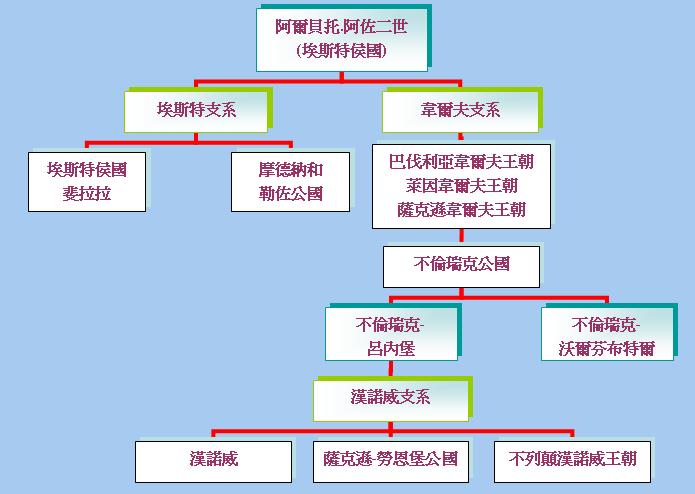 2. 韋爾夫支系起初統治巴伐利亞,其後又統治萊因和薩克遜,並成為德意志「教皇黨」的首領,與「皇帝黨」首領霍亨斯陶芬家族爭奪德意志領導權。該家族成員奧托四世Otto IV更曾繼為阿基坦Aquitaine公爵和德意志國王(註1)。1180年薩克遜公爵海因里希三世Heinrich III兼巴伐利亞公爵海因里希十二世Heinrich XII(我國史書一般稱為「獅子亨利」Henry the Lion)被德意志國王弗里德里希一世Friedrich I(我國史書一般稱為「紅鬍子腓特烈」Frederick Barbarossa)擊敗,韋爾夫家族遂被褫奪巴伐利亞和薩克遜的領地。而奧托四世的德意志王位亦於1214年為霍亨斯陶芬王朝推翻。1235年韋爾夫家族的奧托一世Otto I在德意志西北部建立不倫瑞克Brunswick公國,重建韋爾夫家族的統治。但由1345年起不倫瑞克開始陷入分裂,先後出現不倫瑞克-沃爾芬布特爾Brunswick-Wolfenbuttel、不倫瑞克-呂內堡Brunswick-Luneburg(1692年改稱漢諾威Hanover)等封建諸侯國,韋爾夫支系遂分裂為多個支系,其中漢諾威支系先後於17和18世紀繼承薩克遜-勞恩堡Saxe-Lauenburg和不列顛的君位。但在19世紀德意志統一運動中,不倫瑞克-沃爾芬布特爾、漢諾威和薩克遜-勞恩堡最終被併歸統一的德意志國家。而不列顛的漢諾威王朝則在1901年絕嗣,不列顛王位轉歸薩克遜-科堡-哥達王朝(但部分史家把1901年以後的不列顛國王仍然歸入漢諾威王朝,參見前面「韋廷家族」註3)。