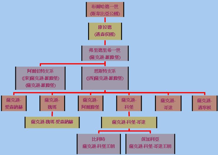 3. 薩克遜支系繼承了薩克遜的統治權。但在1260年薩克遜分裂為薩克遜-維滕堡Saxe-Wittenberg(仍俗稱薩克遜)和薩克遜-勞恩堡Saxe-Lauenburg(一般簡稱勞恩堡)兩國。其後此兩國的阿斯坎尼亞王朝先後在15和17世紀為韋廷王朝和韋爾夫王朝取代。