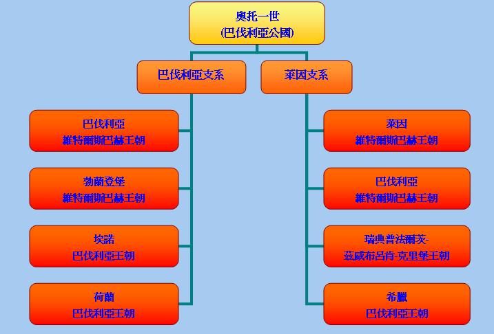 2. 萊因支系(又稱巴拉丁Palatine支系或普法爾茨Pfalz支系)由1410年起陷入分裂。宗教改革期間,該支系領導德意志新教諸侯反對奧地利,並曾在三十年戰爭初期短暫統治波希米亞。其後萊因為西班牙侵佔,並被併歸巴伐利亞。1648年三十年戰爭結束後,該支系恢復萊因之獨立,重振勢力,並在1777年繼承巴伐利亞君位,成為德意志南部重要邦國。此外,本支系成員亦曾統治德意志、瑞典(註1)和希臘。隨著巴伐利亞在1871年被併歸德意志,本支系逐漸退出歷史舞台。
