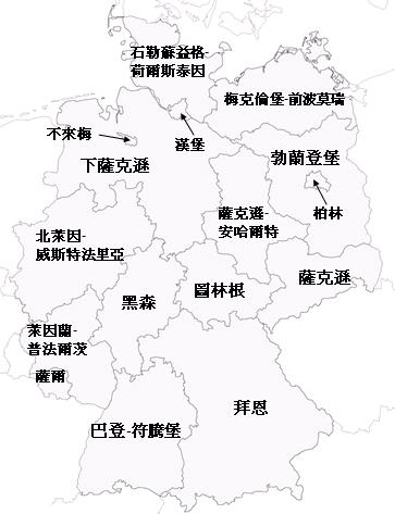 德意志起源於中古時代法蘭克王國的東部。843年法蘭克分裂為三部分,其中[東]法蘭克([East] Frank)於911年演變為德意志王國(10世紀起俗稱神聖羅馬帝國(Holy Roman Empire))。但德意志從一開始便陷入封建割據狀態,先後形成數百個諸侯國、教會領地和自由市,較重要者包括奧地利、勃蘭登堡(Brandenburg)、普魯士(Prussia)(註4)、薩克遜(Saxon)、梅克倫堡(Mecklenburg)、漢諾威(Hanover)、不來梅(Bremen)、漢堡(Hamburg)、石勒蘇益格-荷爾斯泰因(Schleswig-Holstein)、安哈爾特(Anhalt)、圖林根(Thuringen)、巴拉丁(Palatinate,今稱普法爾茨Pfalz)、巴伐利亞(Bavaria,今稱拜恩Bayern)、符騰堡(Wurttemberg)、巴登(Baden)、黑森(Hesse)等,其中奧地利與普魯士先後於17和18世紀崛起成為中歐強國,並爭奪德意志的霸權。19世紀德意志王國解體後,德意志各邦曾先後組成萊因(Rhine)邦聯和德意志邦聯。