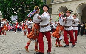 | 烏克蘭語屬「印歐語系斯拉夫語族」,是烏克蘭人(現今烏克蘭的主體民族)的語言。烏克蘭人原為古代羅斯人的一部分。羅斯人在882年以今基輔(Kiev)為中心,建立基輔大公國。11世紀起羅斯人陷入政治分裂狀態,在今烏克蘭地區出現切爾尼戈夫(Chernigov)、沃倫(Volynia)、佩雷雅斯拉夫(Pereyaslavl)、加利西亞(Galicia)等諸侯國,基輔成為各諸侯國的宗主(1169年喪失宗主地位)。經數世紀分裂後,在14世紀形成烏克蘭人。此後烏克蘭人先後受立陶宛和波蘭統治。17世紀,烏克蘭人起事反抗波蘭,成立烏克蘭(Ukraine)哥薩克共和國,成為俄羅斯與波蘭爭奪的對象。1667年俄羅斯和波蘭瓜分烏克蘭,東烏克蘭(Eastern Ukraine)為俄羅斯附庸,西烏克蘭(Western Ukraine)為波蘭附庸,其後兩地分別被併入俄羅斯和波蘭。18世紀末,俄羅斯和奧地利在瓜分波蘭的過程中,各自取得西烏克蘭的部分地區。 |