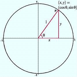 但上述定義只適用於角x為銳角的情況,當x大於或等於直角時,已不成其為直角三角形,上述定義無效。為了使sin和cos的定義能適用於任意角度,必須另闢蹊徑,為此我們引入「單位圓」(unit circle)的概念。單位圓是一個繪在笛卡爾坐標系上的圓,這個圓的圓心位於原點(0,0),半徑為1,如下圖所示: