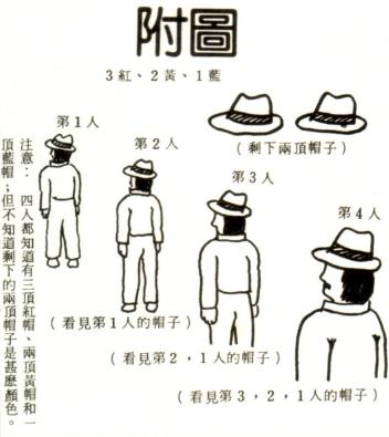 有6頂帽子,其中三頂是紅色,兩頂是黃色,一頂是藍色。現把其中4頂戴在4個人的頭上。這4個人站在一條直線上(不妨把他們稱為「1號」、「2號」、「3號」和「4號」,數字較小的站在前),站在較後的可以看到較前位置的人的帽子,但不能看見較後位置的人的帽子,也不能看見自己戴的那頂帽子。假設這4個人都有推理能力,不會瞎猜,而且能夠聽見我跟他們每個人的對話。現在我問4號是否知道他戴的帽子的顏色,他望望站在前面的3個人的帽子,想了想後答曰:「不知道」。接著我問3號同樣的問題,他也望了望前面兩個人的帽子,分析一下剛才4號的答案,然後答曰:「不知道」。同樣我又問2號,他也是答「不知道」。最後當我問1號時,他便答:「知道」。請看附圖。