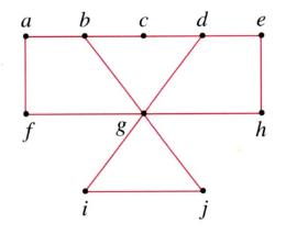 (a) 假設下圖的點(a - j)代表某市鎮10間店鋪的位置,各線段代表連接這些店鋪的道路。某推銷員想設計某條推銷路線,這條路線須為一條循環路線,即終點須與起點相同,且須經過每間店鋪剛好一次,不多也不少(起點和終點除外),但不得重複走任何道路。請問你能否替他找到這條路線?如能,請畫出這條路線。如不能,請解釋為何不能。