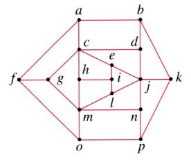 提示:本題是數學上有名的「推銷員問題」(Travelling Salesperson Problem),所求的路線稱為「漢密爾頓回路」(Hamiltonian Cycle)。讀者在解答本題時,可以採取以下思路:首先我們須注意到,如果原圖共有n個點,那麼所要求的路線便須剛好有n條線段(請讀者想想為何是這樣),因此我們可以把求推銷員路線視為刪除線段的過程。由於所求路線須經過每一點剛好一次,因此每一點均只能與另外兩點相連,如某點與超過兩點相連,便須刪去其中某些線。例如在(a)圖中d點與三個點相連(c、e、g),因此必須刪去其中一條線。總括而言,解答本題的策略是,把圖中某些線段刪去,使圖中每點均只與另外兩點相連,那麼所剩下的線段便是所要求的路線。如在刪線過程中出現矛盾,則表示不可能找到所求的路線。